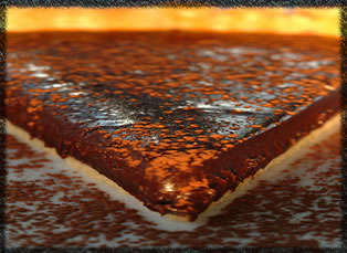 Dust with cacoa powder, ultimately the pastry should be short and crisp and the filling should be smoth and should cut like butter.